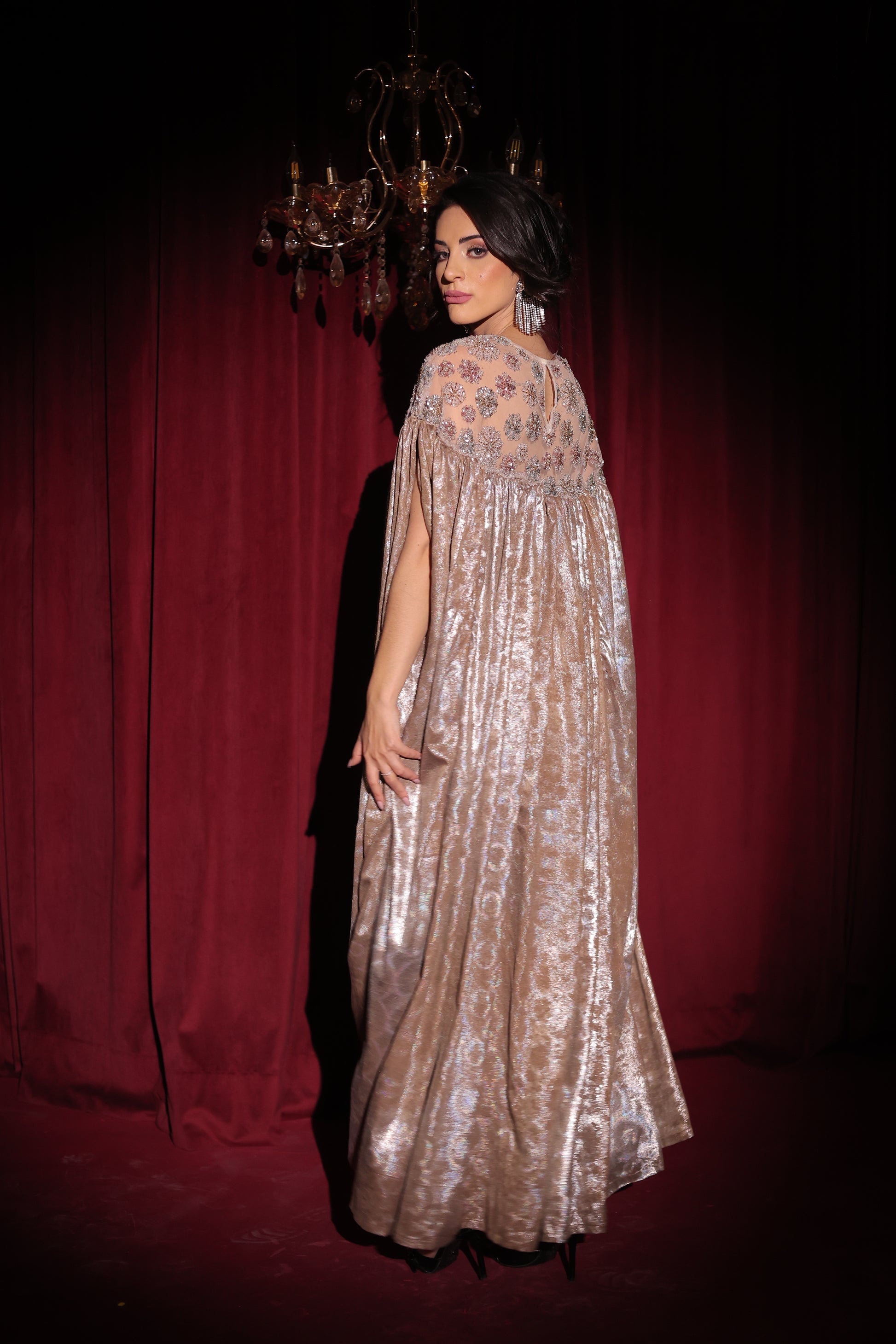 A celebration of fluid elegance and subtle opulence, this foil crepe gown shimmers with every movement. Crafted in softly textured foil crepe, it features a graceful, flowing silhouette with a voluminous fall. Delicate hand embellishments highlight the neckline, while the cape-like drape adds an air of quiet luxury. Perfect for evening soirées, intimate celebrations, and understated statement moments.