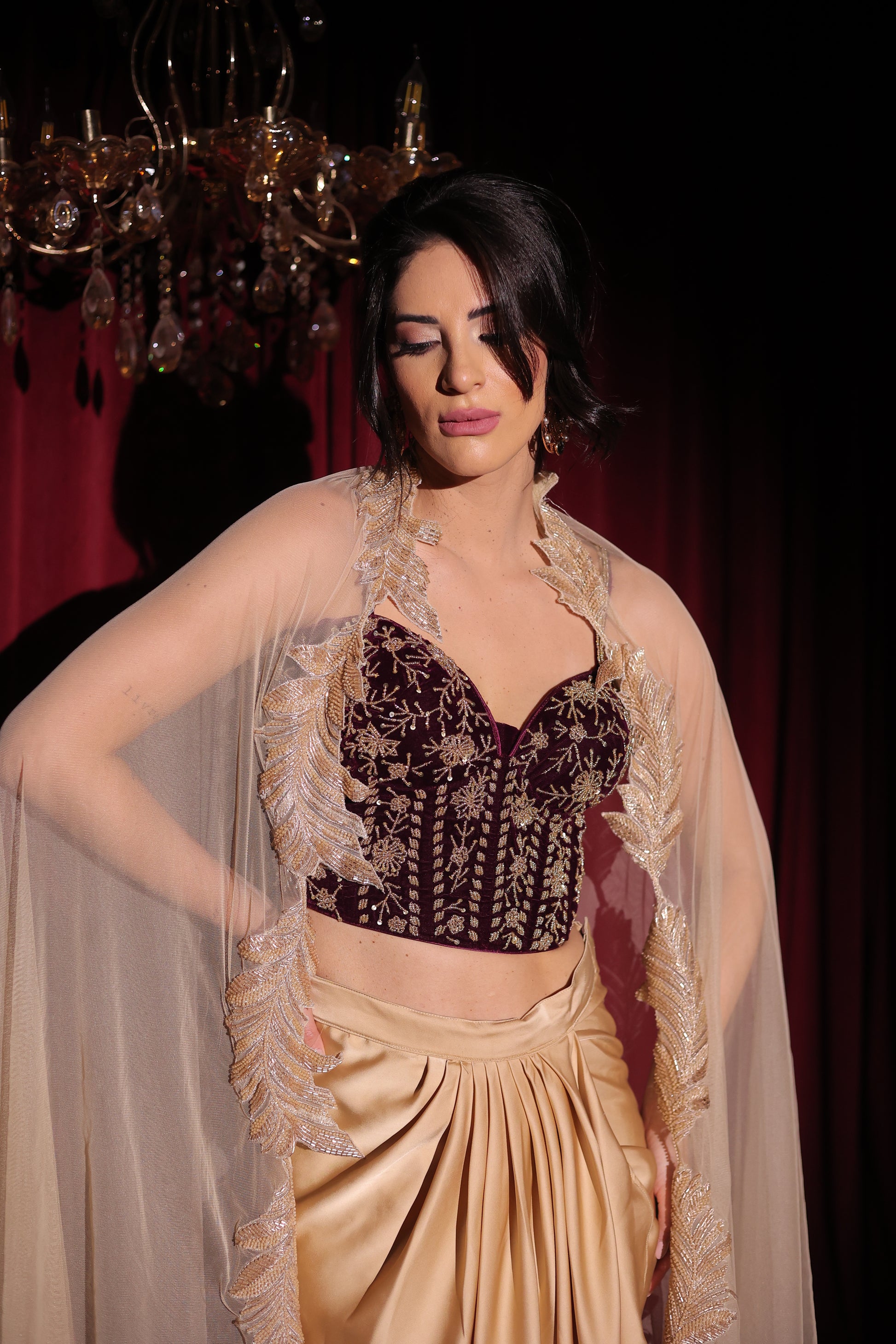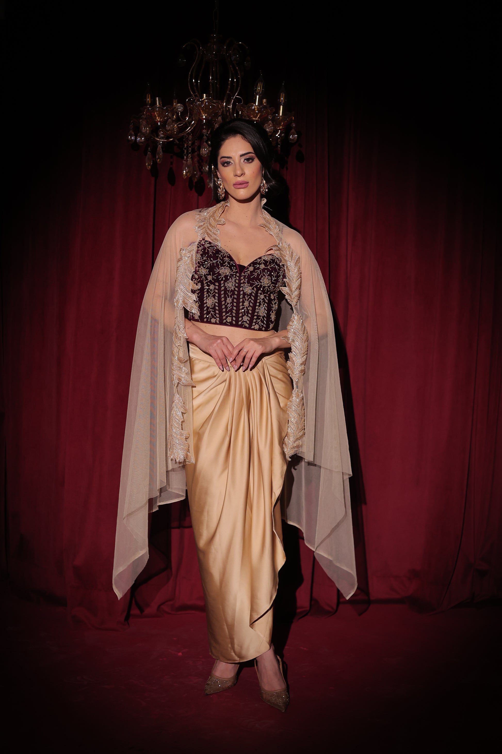 An elegant blend of opulence and modern grace, this ensemble features a structured velvet corset paired with a fluid satin drape skirt with sculpted pleats. A sheer tulle cape with delicate edge embellishment adds ethereal movement and drama. Regal yet contemporary, this piece is perfect for cocktail soirées, wedding festivities, and evening celebrations.