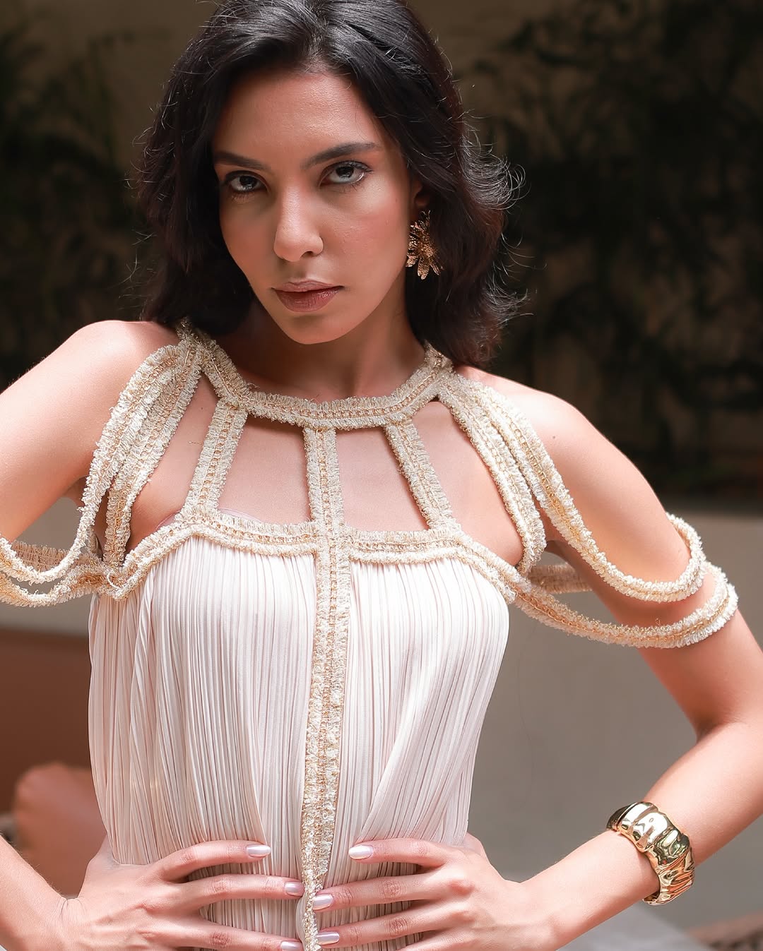 Flowing pleats with luminous detailing for an ethereal finish. Perfect for resort evenings, celebrations, and glamorous vacation nights.